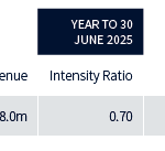The intensity ratio compares emissions with an appropriate metric or financial indicator. We have chosen to use tonnes of CO2e per £ million of revenue. This has improved by 19.7% as Scope 1 and Scope 2 emissions have decreased as revenue has increased.